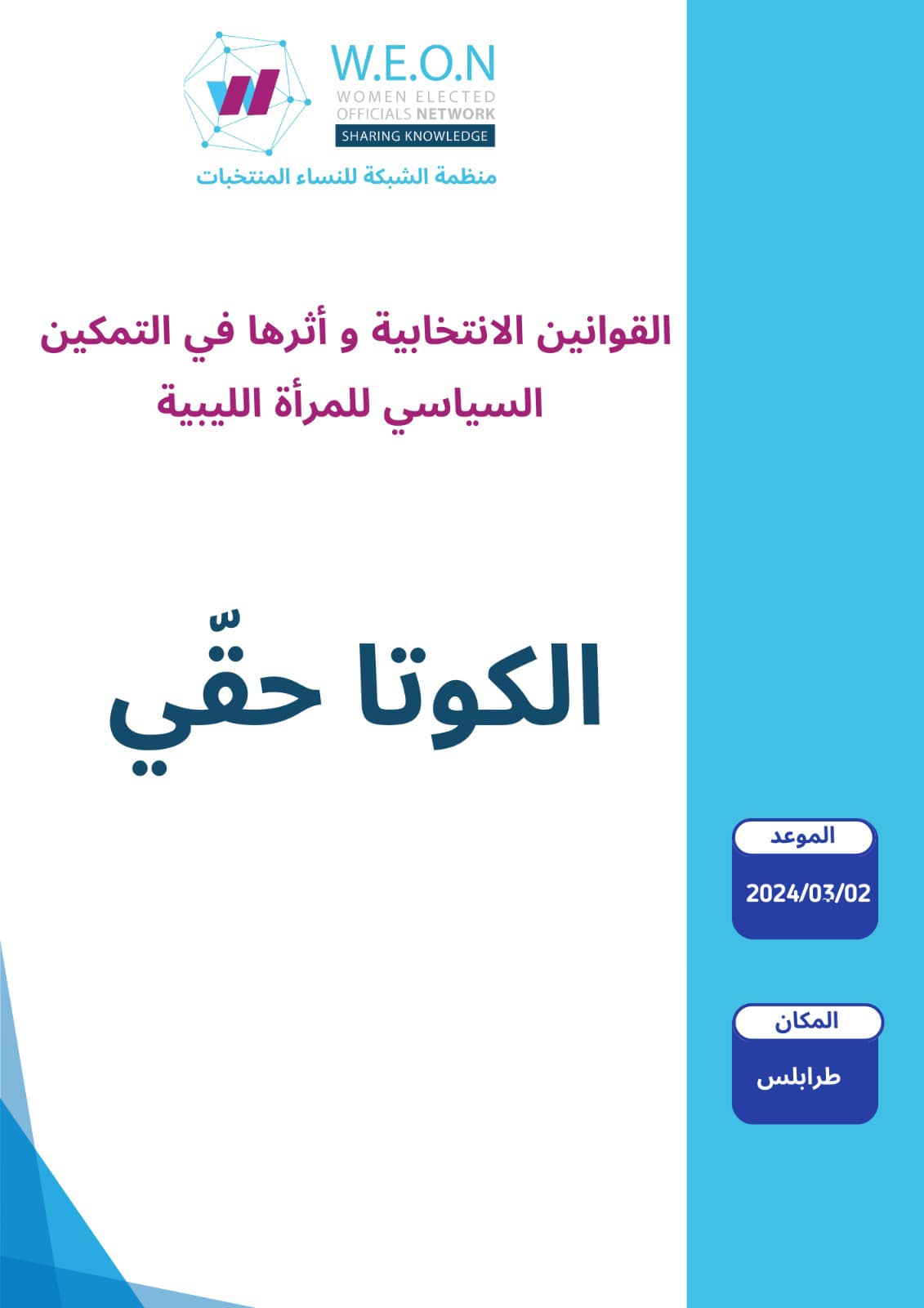 📌 مؤتمر "القوانين الانتخابية وأثرها على التمكين السياسي للمرأة الليبية" 📅 تعزيز دور المرأة في المشهد السياسي الليبي انعقد يوم السبت 2 مارس 2024 مؤتمر "القوانين الانتخابية وأثرها على التمكين السياسي للمرأة الليبية"، بتنظيم منظمة شبكة النساء المنتخبات، بهدف مناقشة التحديات والتشريعات التي تؤثر على مشاركة المرأة في الحياة السياسية. 📍 شهد المؤتمر حضورًا مميزًا من شخصيات سياسية وقيادية، منهم:✅ أعضاء وعضوات من مجلس النواب ومجلس الدولة.✅ سيدات من حراك "الكوتا حقي" وتجمع المرأة الحزبية.✅ ممثلات عن الاتحاد النسائي الليبي ومفوضية المجتمع المدني.✅ قيادات من المجلس القومي للمرأة الليبية والمفوضية العليا للانتخابات.✅ وزيرات ووكيلات من مختلف الوزارات. 📌 محاور المؤتمر [...]