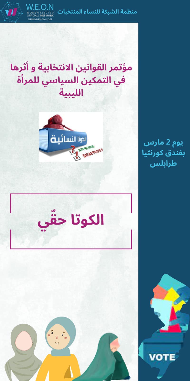 📌 مؤتمر "القوانين الانتخابية وأثرها على التمكين السياسي للمرأة الليبية" 📅 تعزيز التمثيل السياسي للمرأة في ليبيا في إطار تعزيز الدور الاستراتيجي والسياسي للمرأة وضمان مشاركتها الفاعلة في الحياة السياسية، تستعد منظمة شبكة النساء المنتخبات لتنظيم مؤتمر بعنوان: 📍 "القوانين الانتخابية وأثرها على التمكين السياسي للمرأة الليبية" يهدف المؤتمر إلى:✅ مناقشة القوانين الانتخابية الحالية ومدى تأثيرها على مشاركة المرأة في المجالس المنتخبة.✅ تحليل التحديات التي تواجه المرأة في الانتخابات والمناصب القيادية.✅ طرح استراتيجيات لتعزيز التمثيل النسائي في مؤسسات صنع القرار. 📌 أهمية المؤتمر 🔹 يسعى هذا الحدث إلى تسليط الضوء على الإصلاحات المطلوبة في القوانين الانتخابية لضمان تمكين المرأة سياسيًا [...]